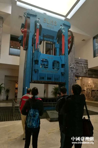 两岸专家参观柳州市工业博物馆中150吨重、高达10米的双动压力机。(中国台湾网 李杰 摄)