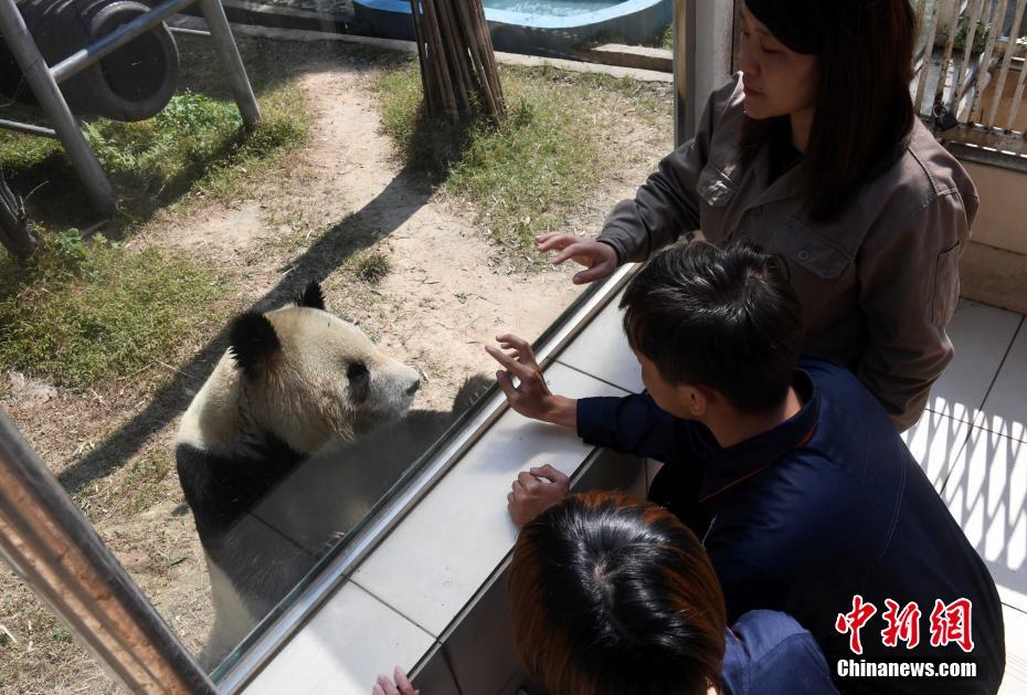 福州熊猫世界以独特的科研驯化、大熊猫生殖生理研究、异种克隆大熊猫试验和配套的青少年科普教育设施而闻名中外。图为2名台湾大学生在海峡(福州)熊猫世界近距离观察大熊猫。 刘可耕 摄