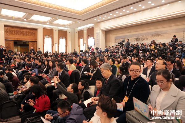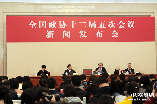 3月2日下午,全国政协十二届五次会议新闻发布会在人民大会堂一层新闻发布厅举行。(中国台湾网 李宁 摄)