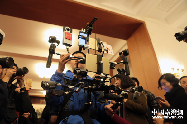 3月2日下午,全国政协十二届五次会议新闻发布会在人民大会堂一层新闻发布厅举行。图为现场记者使用的钢铁侠多信道直播云台设备。(中国台湾网 李宁 摄)
