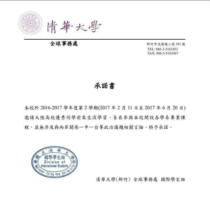 台湾新竹清华大学与大陆高校签订的“一中承诺书”曝光
