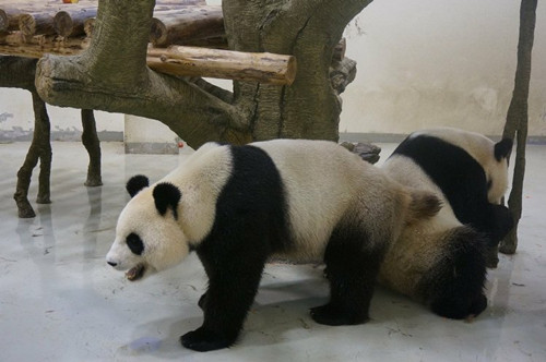 “圆圆”已经出现大熊猫交配的“举尾”行为,但是“团团”根本不理睬,依旧坐在地上猛吃。(图片来自台媒,台北市立动物园提供)