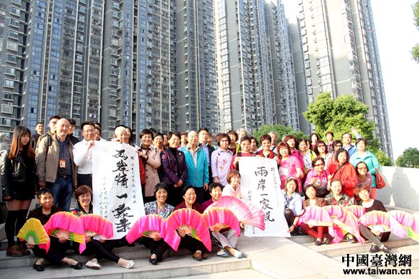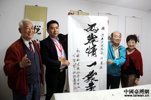 社区居民洪鸿喜(左一)与台湾交流团团长林丰成(右二)聊得十分投机,这位曾经的老兵39年出生,现场挥毫写下了“两岸情 一家亲”的书法条幅赠给台湾同胞。(中国台湾网 李杰 摄)