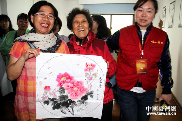 台湾的梁惠英(左)与虹桥社区的董凤英(中)同是教师,两人一见如故,倾谈得十分开心。(中国台湾网 李杰 摄)