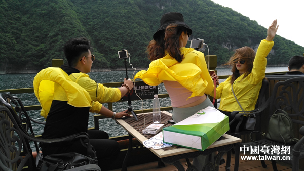 斗鱼主播在江上做直播(中国台湾网 王文英 摄)