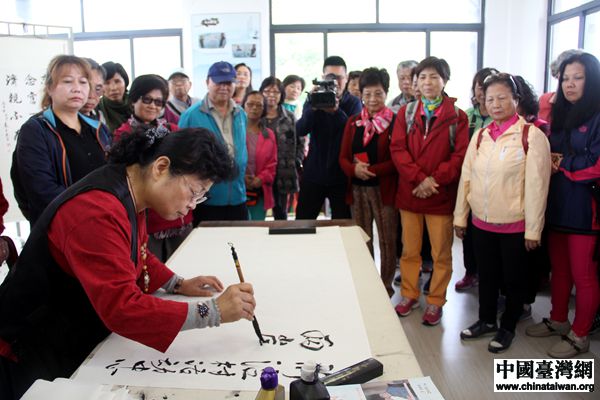 台湾参访团成员高好未女士写下 “两岸情 一家亲 共创美好未来” 书法条幅赠送新治村活动中心。(中国台湾网 李杰 摄)