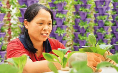 图为该县双流镇三合村布依族村民在台湾产业园白果塘分园内护理立体式栽培蔬菜。