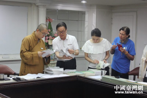 庹纯双一行向佛光山赠送采用庹氏书法技法编辑出版的全国中小学生系列《写字教材》,慧屏法师代表佛光山受赠。(中国台湾网发)