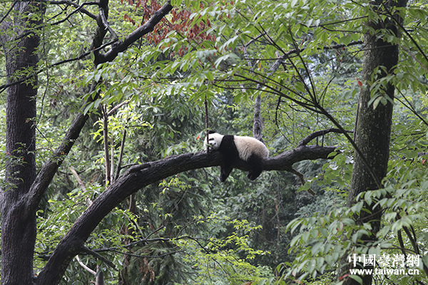 大熊猫汪佳在悠闲吃竹子。(中国台湾网 李宁 摄)