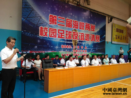 第三届海峡两岸校园足球友谊邀请赛上马铁主持。(中国台湾网 韩静 摄)