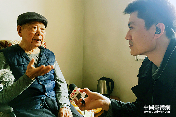 老兵陈阿统出生在台湾新竹,1945年台湾光复那年他17岁,加入了前来接收台湾的国民党军队。1947年,随国民党军队渡海到大陆。后来,加入了解放军,退伍后一直留在大陆工作生活,离别40多年后才回到台湾探亲。图为陈阿统(左)接受记者穆亮龙(右)采访。