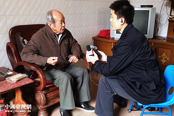 沈涿良老先生1950年跟随国民党军队撤退到台湾,1987年才搭上了第一批回大陆探亲的飞机,如今已回到福建省漳州市东山县东沈村的老家定居。图为沈涿良先生(左)接受记者穆亮龙(右)采访。