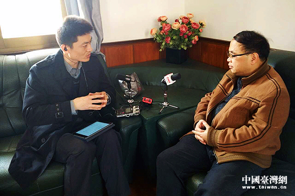厦门大学台湾研究院政治研究所所长张文生认为,虽然两岸隔绝了将近四十年,但是两岸天然的血缘联系从来就没有断过,随着返乡探亲的开启,民间交流向多元化、各个领域开拓。图为张文生所长(右)接受记者穆亮龙(左)采访。