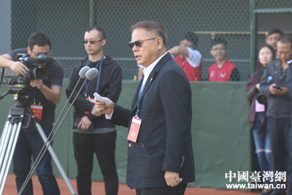 海峡两岸棒球交流合作委员会名誉主席彭诚浩在开幕式上致辞。(中国台湾网 陈文韬)