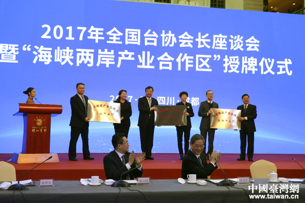中共中央台办、国务院台办12月27日在四川成都召开2017年全国台协会长座谈会。会上,国务院台办与发改委、商务部宣布在四川设立海峡两岸产业合作区,为台资企业在中西部地区发展搭建新的平台。图为授牌仪式。(中国台湾网 王怡然 摄)