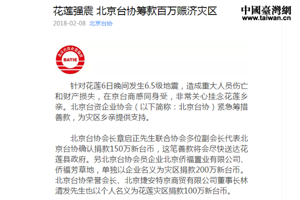 “花莲6日晚间发生6.5级地震,造成重大人员伤亡和财产损失,在京台商感同身受,非常关心挂念花莲乡亲。”北京台资企业协会(以下简称“北京台协”)8日在微信公众号上宣布,北京台协会长章启正先生联合协会多位副会长代表北京台协确认捐款150万新台币,这笔善款将会尽快送达花莲县政府。另北京台协会员企业北京侨福置业有限公司、侨福芳草地,单独以企业名义为灾区捐款200万新台币。北京台协荣誉会长、北京捷安特京商贸有限公司董事长林清发先生也以个人名义为花莲灾区捐款100万新台币。