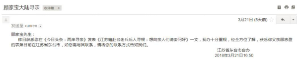就在头条寻人将顾家宝的寻亲消息发布后,寻人邮箱便收到来自江苏省东台市台办的邮件,使得寻亲过程有了重大进展。