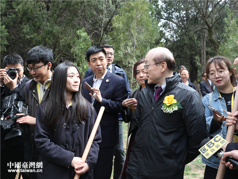 4月5日上午,中共中央台办、国务院台办主任刘结一与台湾青年在黄陵县桥山“思源林”同植“连根柏”。(中国台湾网发)