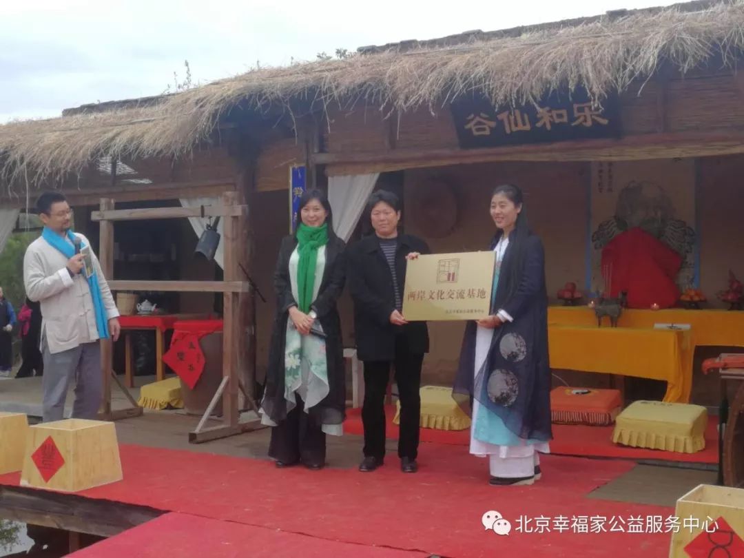 段宝林教授致辞之后,在众多嘉宾见证下,北京幸福家公益服务中心与乐和仙谷举行了两岸文化交流基地的授牌仪式,双方将在今后共同推动社会资源的整合,把仙谷建设成为两岸传统文化交流的实践基地。北京幸福家公益服务中心海峡翔云专委会秘书长覃研女士在现场发言中讲到:“幸福家与乐和仙谷在2017年结缘,共同举办过国内第一部原创大型古诗词音乐故事《少年游》的演出活动,演出在社会上反响热烈。2018年,幸福家与中国文化院共同成立海峡翔云专委会,专委会由原全国人大副委员长许嘉璐先生作为总顾问,致力于推动两岸民间的文化交流与研究工作。这些年,乐和仙谷在传统文化的创承、创新、落地实践方面已经做了大量有意义的工作,也获得了包括国学大师楼宇烈教授、生态文明领域研究专家、国家行政学张孝德教授等社会各界人士的认可。幸福家选择乐和仙谷作为第一家合作共建的两岸文化交流基地,希望平谷乡村的乐和仙谷能够与幸福家在城市的两岸文化客厅瑷瑅空间,未来充分展开城乡联动,为两岸的文化交流贡献力量。”