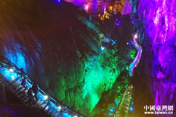 “山有小口,仿佛若有光……”行进在蜿蜒曲折的山路上,最先映入眼帘的是被称为“桃源秘径”的太古洞。据悉,它长约3公里,距今已经有3亿多年的历史。钟乳挺拔,石笋丛生,石幔高挂,石柱巍峨,五彩斑斓的太古洞中,如梦似幻,在我们眼中,这里或许应该被称作“地下桃花源”。穿过悠长的太古洞,我们终于见到了它……