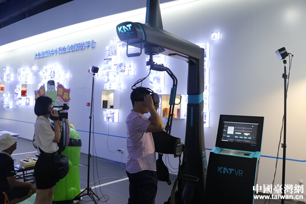 记者体验云栖小镇VR设备。(中国台湾网 李奕均 摄)