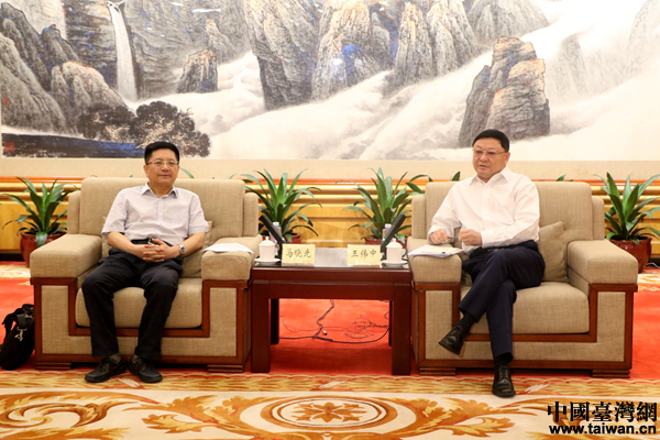 深圳市委书记王伟中(右)会见“海峡两岸记者特区行”联合采访团一行,国务院台办新闻局局长马晓光(左)参与会见。(中国台湾网 尹赛楠 摄)