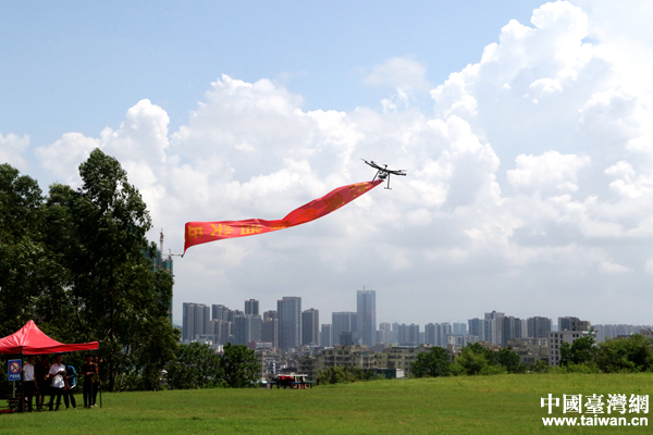 无人机表演吊挂条幅。(中国台湾网 尹赛楠 摄)