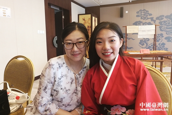 实习生杜旻蓉(右)与书法指导老师朱文剑(左)。(中国台湾网 张露露 摄)