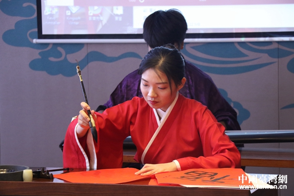 杜旻蓉在展示书法。(中国台湾网 张露露 摄)