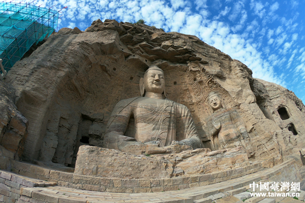 云冈石窟中标志性露天佛像。(中国台湾网 袁楚 摄)