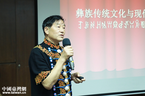 中国民间文艺家协会副主席沙马拉毅向台湾青年及基层民众讲彝族文化。(图片为主办方供图)