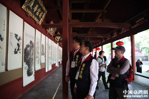 来自台湾的伙伴们正在进行书画展参观(中国台湾网 许晗 摄)