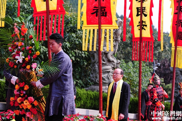 中国国民党前副主席蒋孝严献进献花篮。(中国台湾网 雍紫薇 摄)