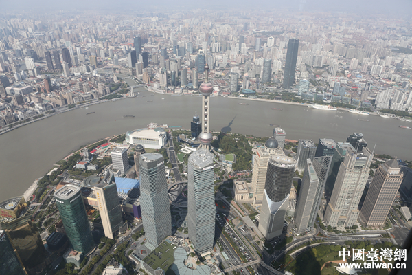 上海中心大厦顶层一览外滩景色。(中国台湾网 陈佳慧 摄)