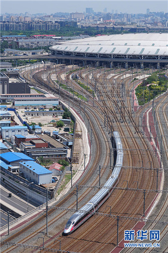 6月26日,“复兴号”G123次列车驶出北京南站。当日,中国标准动车组“复兴号”在京沪高铁两端的北京南站和上海虹桥站双向首发,分别担当G123次和G124次高速列车。“复兴号”是由中国铁路总公司牵头组织研制、具有完全自主知识产权、达到世界先进水平的中国标准动车组。(新华社记者 邢广利 摄)