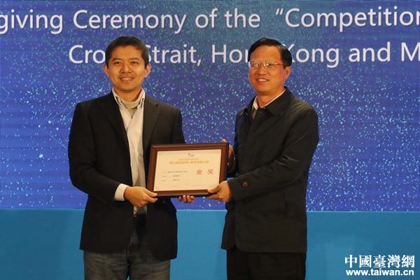 海峡两岸暨香港、澳门互联网+青年创客大赛台湾金奖获奖者上台领奖。(中国台湾网 张亚静 摄)