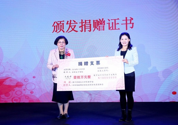蔡玲兰理事长代表台湾女企业家代表团向“百杰关爱基金”捐赠助学金10万元人民币用于帮助中华女子学院困难家庭的大学生。