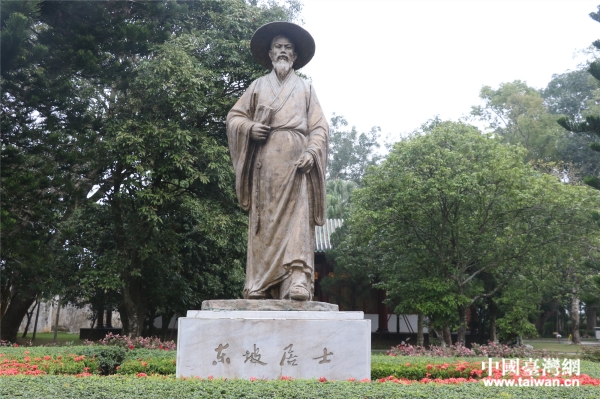 东坡书院内,东坡笠屐铜像矗立在姹紫嫣红的鲜花丛中。(中国台湾网 李宁 摄)