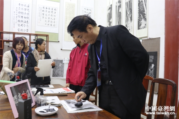 记者体验拓片制作。(中国台湾网 李宁 摄)