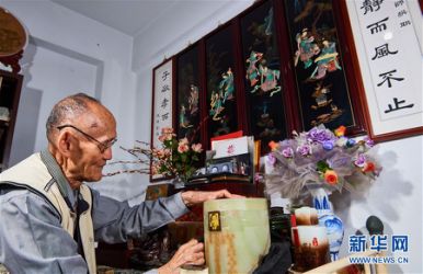 2017年11月14日,高秉涵在擦拭一位老兵的骨灰坛。新华社记者 赵颖全 摄