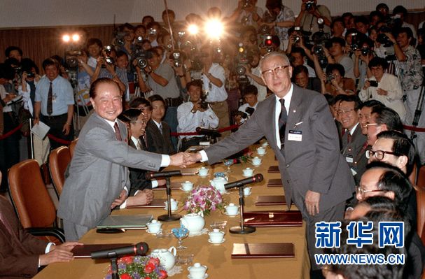 1993年4月27日“汪辜会谈”前汪道涵与辜振甫握手。 新华社发
