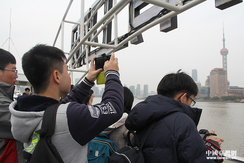 当日下午,两岸青年乘坐邮轮,游览了黄浦江沿岸风光,感受到高楼耸立,摩登繁华的现代化上海风貌。在上海中心大厦,546米的上海之巅,目及外滩灯光璀璨,他们直呼,“上海好酷好美!”
