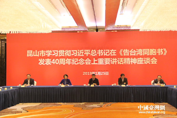 中国台湾网1月25日昆山讯 (记者 汪明珠)25日,以“汇聚同胞之力 促进融合发展”为主题的学习贯彻习近平总书记重要讲话精神座谈会在昆山召开。昆山市相关领导、市台办等单位主要负责人以及台商、台青代表等50余人共聚一堂,学习贯彻落实习近平总书记重要讲话精神,探讨全面推进昆台深度融合。