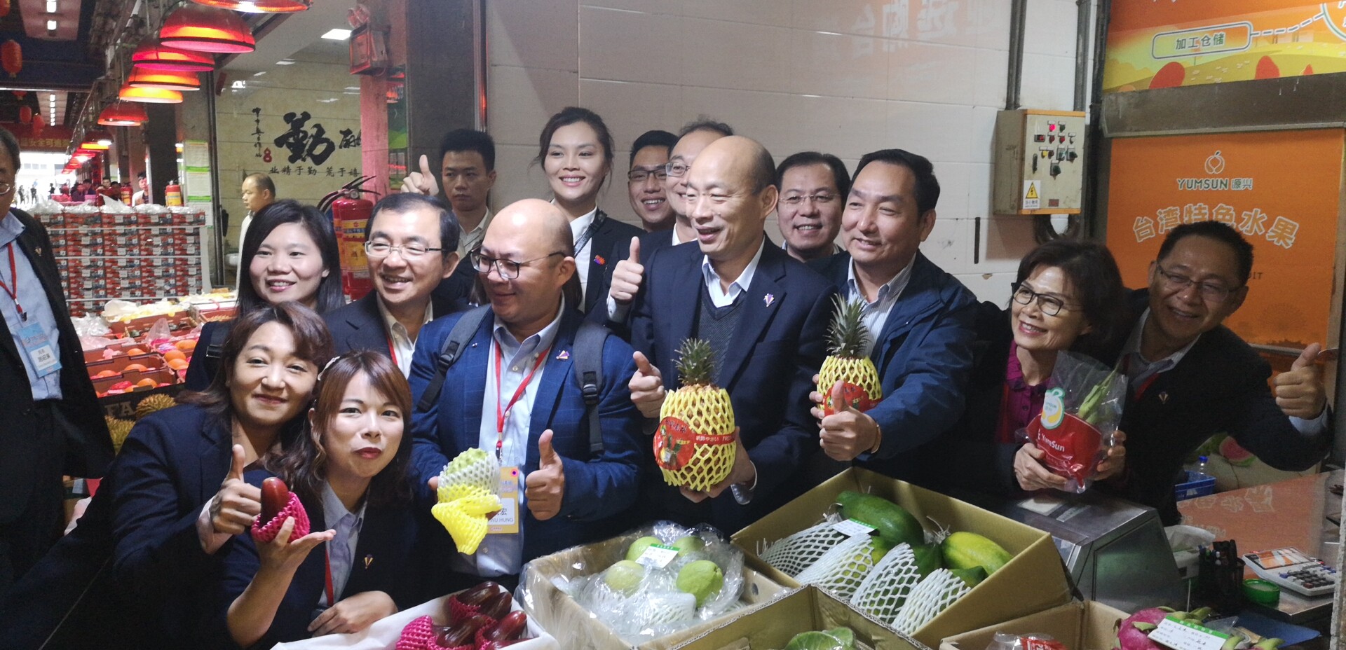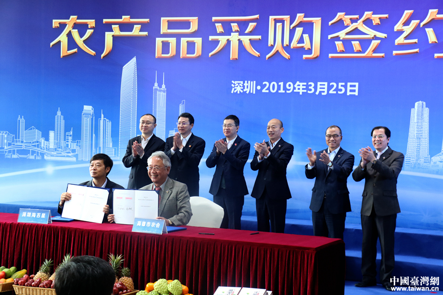 3月25日,韩国瑜一行喜提大陆超大订单:深圳市吉星国际农产品管理有限公司代表深圳市4家公司同高雄市农会签订协议,未来起4年内采购高雄出产的农产品共计人民币两亿元。韩国瑜市长在签约仪式上又露出了标志性的萌萌哒微笑~