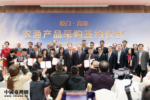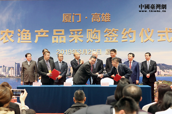 26日下午,厦门与高雄两地企业举行农渔产品采购签约仪式,厦门市副市长韩景义、高雄市市长韩国瑜共同见证了签约仪式。(中国台湾网 陈佳慧 摄)