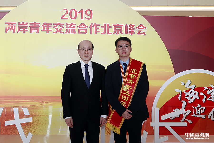 中央台办、国务院台办主任刘结一与首位获得“北京青年五四奖章”的台湾青年合影。(海淀区新闻中心供图)
