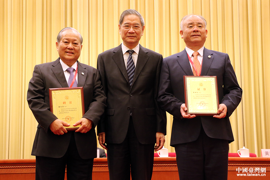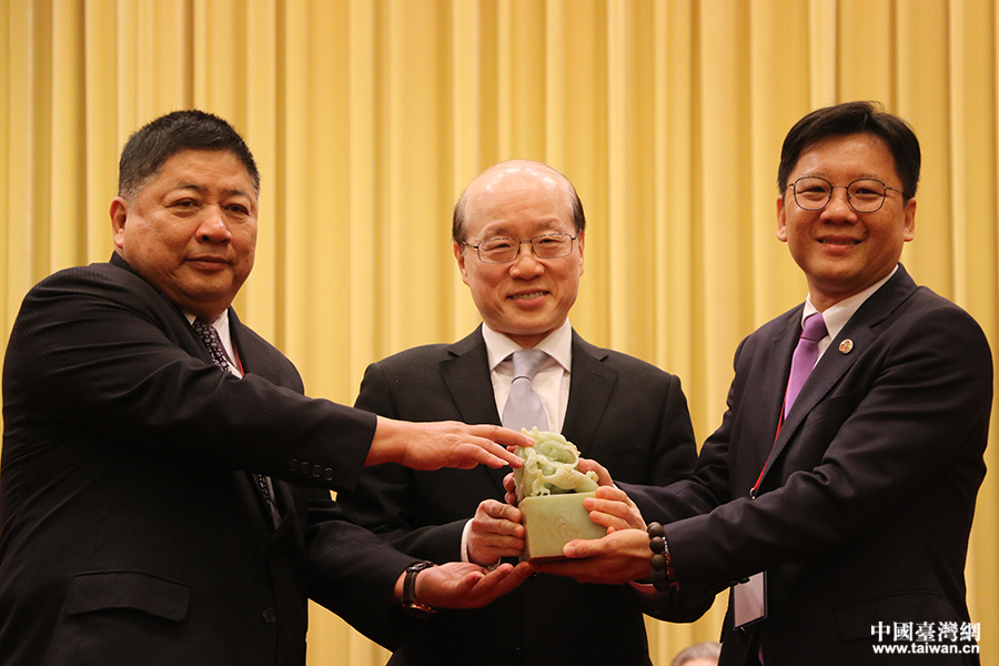 中共中央台办、国务院台办主任刘结一为第五届会长李政宏授印,为新任荣誉会长王屏生授牌。(中国台湾网 张洁 摄)