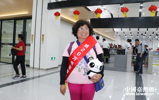 来自台中的刘细妹是玉环市大麦屿港对台直航第20万人次幸运旅客。(中国台湾网 普燕 摄)