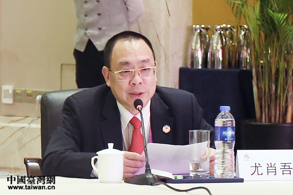 澳门归侨总会副监事长尤肖吾在海峡两岸暨港澳侨界圆桌峰会上发言。(中国台湾网 贾若澜 摄)