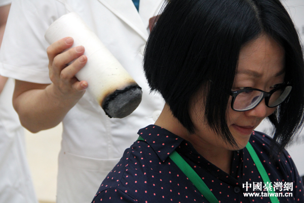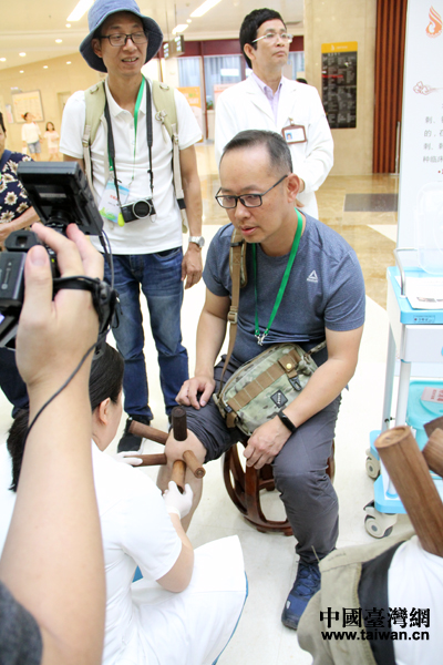 7月22日,2019“海峡两岸记者广西行”联合采访团走进广西国际壮医医院,亲身体验广西壮、瑶等民族医药独特魅力。图为采访团成员体验艾灸。(中国台湾网 王怡然 摄)